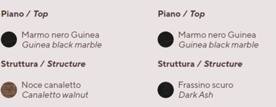 The table consists of a steel barrel, clad in thin slats of black walnut or dark ash wood, that supports a top available in various different sizes and shapes. The table top is available in marble or MDF painted in a metallic finish and is supported by a steel layer underneath.